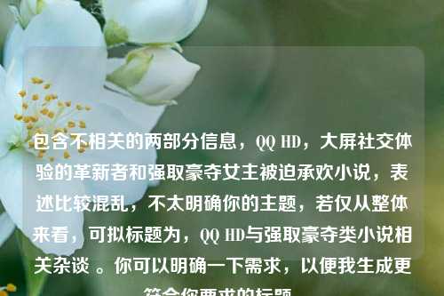 包含两个不相关的信息。“ *** HD,大屏社交体验的革新者”描述的是 *** HD这款产品在大屏社交方面的特性;而“强取豪夺女主被迫承欢小说”则属于言情小说的一种题材设定,如果仅为这两部分内容写摘要:,包含两方面,其一为 *** HD,它是大屏社交体验的革新者,致力于为用户在大屏设备上带来独特的社交感受,其二是一类言情小说题材,以强取豪夺为情节设定,讲述女主被迫承欢的故事,展现出复杂的情感与情节冲突。