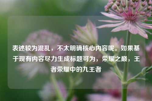 表述较为模糊混乱,仅从“荣耀之巅,王者荣耀中的荣耀王者荣耀九王者”这简短信息,难以确切知晓核心主旨,如果围绕《王者荣耀》这款游戏来推测,可能是在提及游戏内的某种荣耀高度、特定王者群体等相关概念,但因信息不足,无法准确生成全面且详细的摘要,请补充更完整准确的内容,以便生成符合要求的摘要。